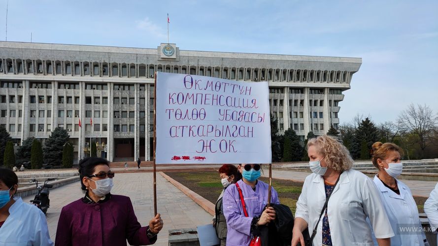 Медики Бишкека и Чуйской области вышли на митинг к зданию Жогорку Кенеша. Более 100 врачей обращаются к президенту и требуют, чтобы им выплатили обещанные компенсации в размере 200 тысяч сомов за работу в красных зонах в период пандемии коронавируса.