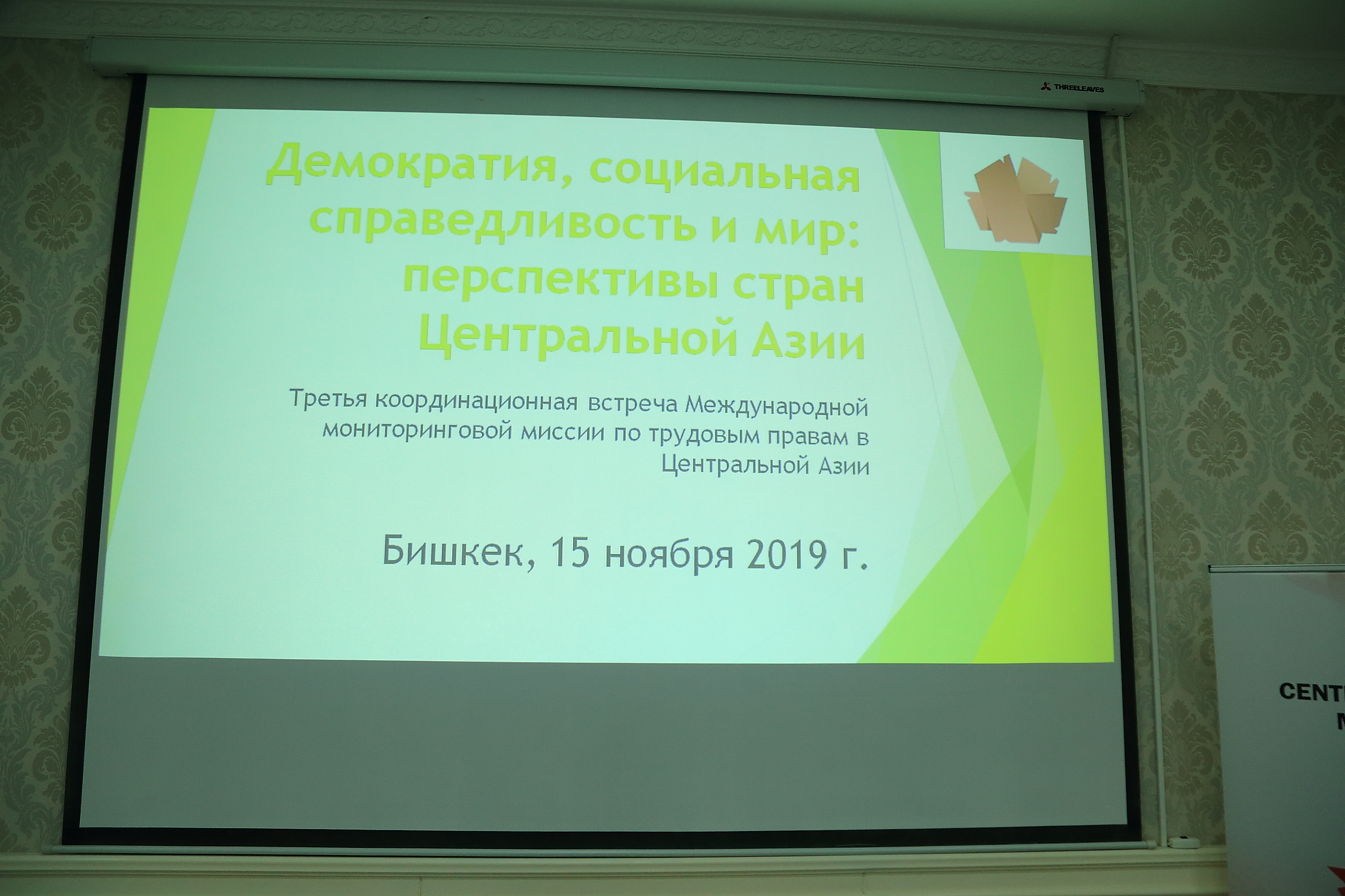 В течение трех дней, с 14 по 16 ноября 2019 года, в Бишкеке состоялась Третья координационная встреча Международной мониторинговой миссии по трудовым правам в Центральной Азии. Во встрече приняли участие представители независимых профсоюзов и правозащитных организаций из Беларуси, Германии, Казахстана, Кыргызстана, Молдовы, России, Франции, США, Таджикистана, Туркменистана, Узбекистана и Украины. В ходе встречи был принят итоговый документ «Демократия, социальная справедливость и мир: перспективы стран Центральной Азии», содержащий оценку ситуации в сфере трудовых прав и рекомендации в адрес правительств Казахстана, Кыргызстана, Таджикистана, Туркменистана и Узбекистана.