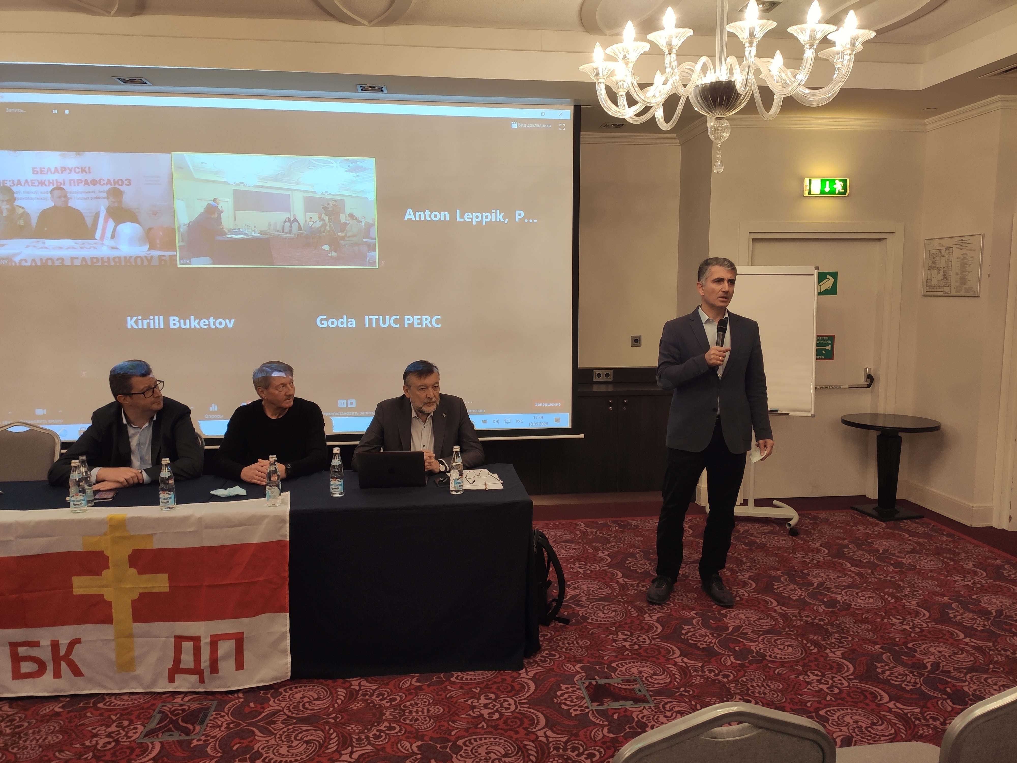 По видеосвязи во встрече приняли участие лидеры стачкома ОАО «Беларуськалий» и Белорусского независимого профсоюза (БНП). Заместитель председателя БНП Александр Мишук подробно рассказал о давлении и репрессиях в отношении профсоюзных активистов и лидеров стачкомов. В ход идут увольнения, дисциплинарные взыскания, лишения премий, вызовы на многочасовые изнуряющие допросы. У активистов и работников силовые структуры увозят на штраф-стоянки автомобили, якобы проверяя их на угон. Шесть членов Белорусского независимого профсоюза задержаны, многие уже отбыли наказание за участие в протестах, отсидев по несколько суток.